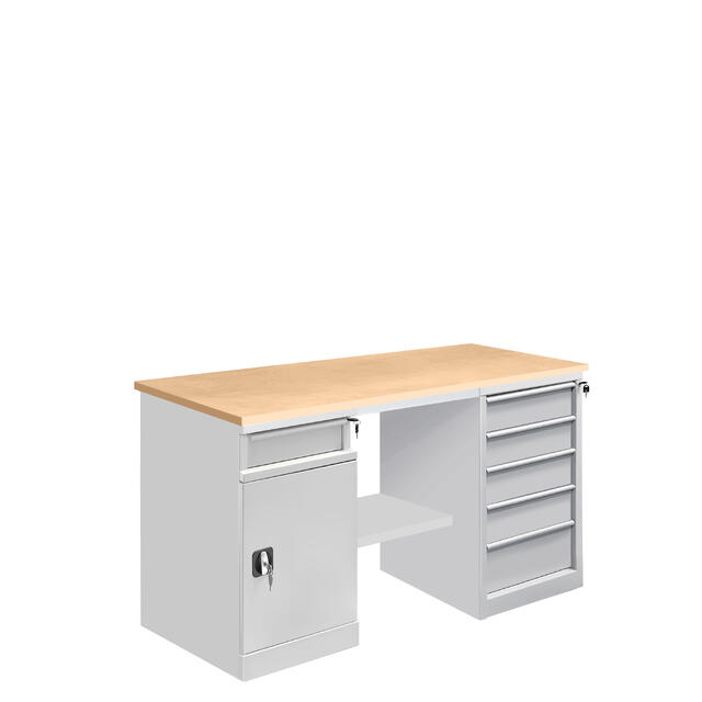 На тумбах установлен центральный и ригельный замок для индивидуального доступа. Ручки тумбы ТС-5 изготовлены из алюминиевого профиля с анодированным покрытием и боковыми пазами для установки обозначения (маркировки) ящиков по их прямому назначению (подразделение организации, документация, инструменты, материалы и т.д.). В зависимости от габаритов используемых инструментов, материалов и оснастки возможно подобрать тумбу верстака с разным количеством ящиков. Нижняя полка верстака изготовлена из металла для устойчивого положения верстака и позволяет организовать хранение материалов.