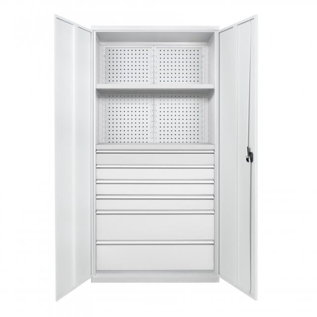 Предназначен для хранения инструментов и рабочих принадлежностей. На задней стенке шкафа расположена перфопанель, на которой могут быть размещены крючки для инструментов. 6 выдвижных ящиков на телескопических направляющих.