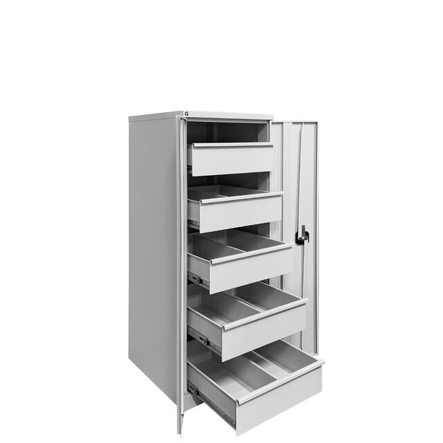 Металлический двухдверный шкаф для инструментов ШДИ. Оснащен плавно выдвигающимися ящиками размером (внутр.): 226 × 130 × 524 мм, каждый из которых разделён металлической перегородкой.
