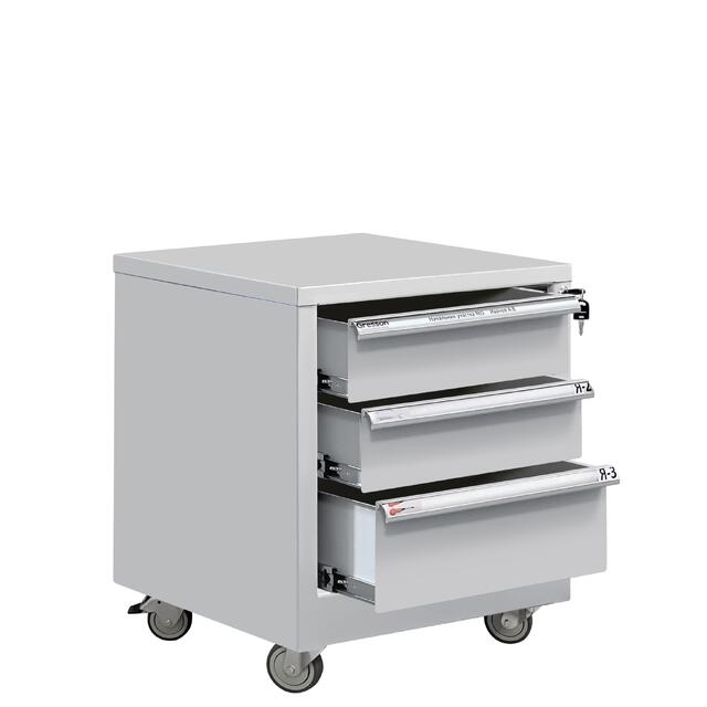 Все металлические тумбы Gresson оборудованы центральным замком для индивидуального доступа. Каркас и ящики изготовлены из листового металла для увеличения эксплуатационного ресурса и повышения надежности. Ручки изготовлены из алюминиевого профиля с анодированным покрытием и боковыми пазами для установки обозначения (маркировки) ящиков по их прямому назначению (подразделение организации, документация, инструменты, материалы и т.д.). Ящики выдвигаются во всю длину, облегчая доступ к материалам. Тумба имеет 4 колеса (d-75 мм), два из которых с механизмом фиксации (тормозом).