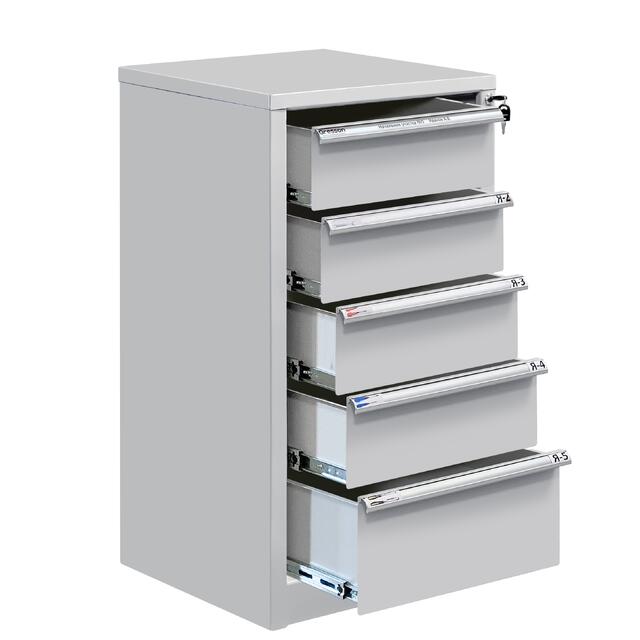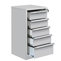 Тумба металлическая ТС-5 может быть использована для работы и организации хранения материалов как в составе рабочих мест, так и в виде отдельно используемой единицы. Ящики металлической тумбы имеют различные размеры, что позволяет организовать в них хранение как крупных материалов и инструментов, так и мелких комплектующих.