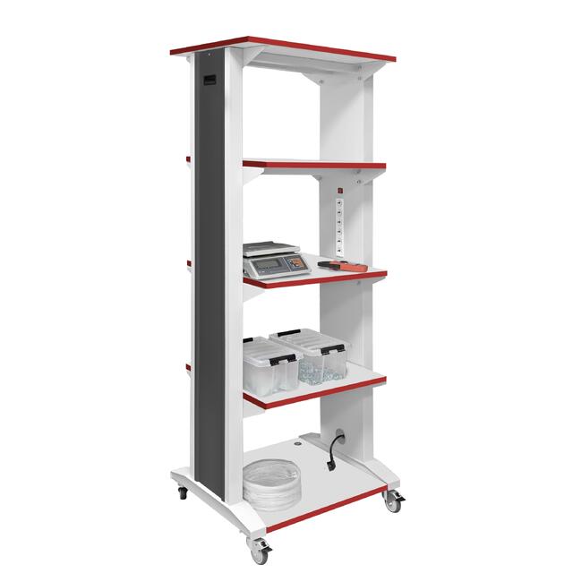 5 полок. Предназначена для размещения приборов, оборудования и дальнейшего их перемещения в рабочей зоне. Встроенная электромонтажная панель с 6 розетками и выключателем питания с подсветкой. Изготавливается в промышленном и антистатическом исполнении