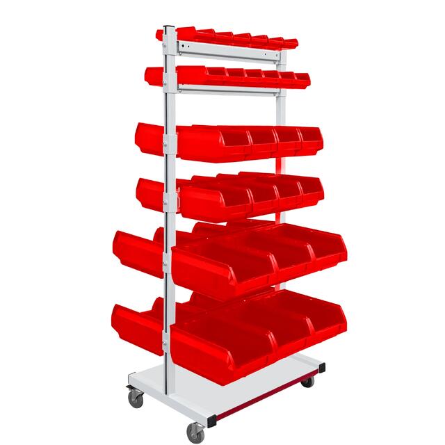 Стойка мобильная для лотков используется для хранения и перемещения комплектующих в рабочем пространстве. Шесть двусторонних планок регулируются по высоте для подбора необходимого расстояния между ними.