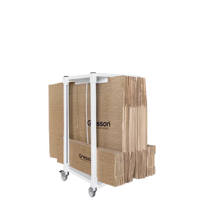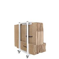 Cтойка СКМ используется для хранения и перемещения картонных заготовок, коробов. Полки имеют плавную, индивидуальную регулировку высоты и оборудованы перегородками для фиксации и разделения изделий. Верхняя полка имеет полость с резиновым покрытием для размещения вспомогательных, измерительных, канцелярских и иных принадлежностей. Стойка имеет четыре поворотных колеса (Ø 75 мм), два из которых оснащены тормозами. Каркас и полки выполнены из стали с эпоксидно-порошковым покрытием (Опционально RAL 7035). Максимальная нагрузка на стойку — 80 кг. Стойку для картонных коробок можно разместить рядом с рабочим столом, на складе или в зоне комплектации и упаковки.