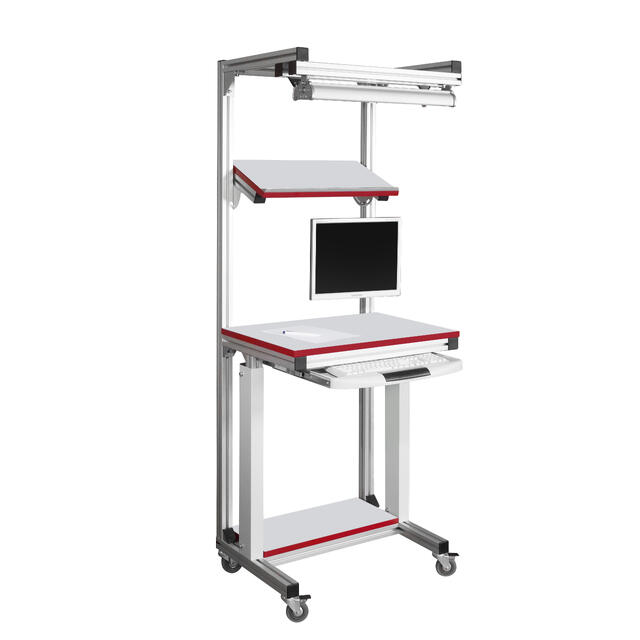 Стойка подкатная компьютерная из конструкционного профиля СПК-КП является мобильным рабочим местом с возможностью перемещения компьютерной техники и принадлежностей в рабочей зоне. Стойка оснащена: регулируемой по высоте наклонной полкой с упором от скатывания, нижней полкой, комплектом светодиодного освещения КОС-КП, четырьмя колесными опорами, две из которых с механизмом фиксации. Высота подкатной стойки — 1950 мм., ширина — 700 мм., глубина — 550 мм.