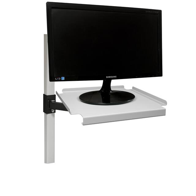 Кронштейн поворотный с подставкой КПС используется для размещения различного рода портативной оргтехники, периферийных устройств и приспособлений. Металлическая площадка имеет габарит 320х320 мм, снабжена удобной ручкой для вращения и пазами для укладки электропроводов устройств. Конструкция кронштейна позволяет расположить подставку на нужном расстоянии от места крепления и под необходимым углом разворота, что создает комфортные условия для использования размещённых на ней устройств. Прочная и долговечная конструкция. Рекомендуемая максимальная нагрузка на кронштейн - до 20 кг.