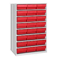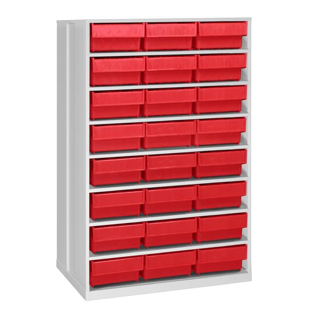 Кассетница имеет 24 лотка и используется для хранения комплектующих и упорядоченности деталей. В зависимости от размера, кассетницы можно закрепить на стене, установить на рабочей поверхности или использовать в поворотных стойках. Так обеспечивается сохранение эксплуатационных свойств комплектующих и экономится пространство.