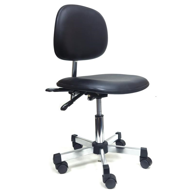 ESD. Искусственная кожа (винил). Высота регулировки: 430~570 мм. Размер сиденья: 440x400 мм. Размер спинки: 380x290 мм. Регулировка сиденья вверх и вниз, регулировка спинки по высоте, регулировка угла наклона спинки. 5-ти лучевое основание без сварки из холоднокатаной стали с покрытием, диаметр 520 мм; 5 антистатических колес (нейлон). Антистатическое исполнение: поверхностное и объемное сопротивление 10Е5-10Е8 Ом. Цвет черный
